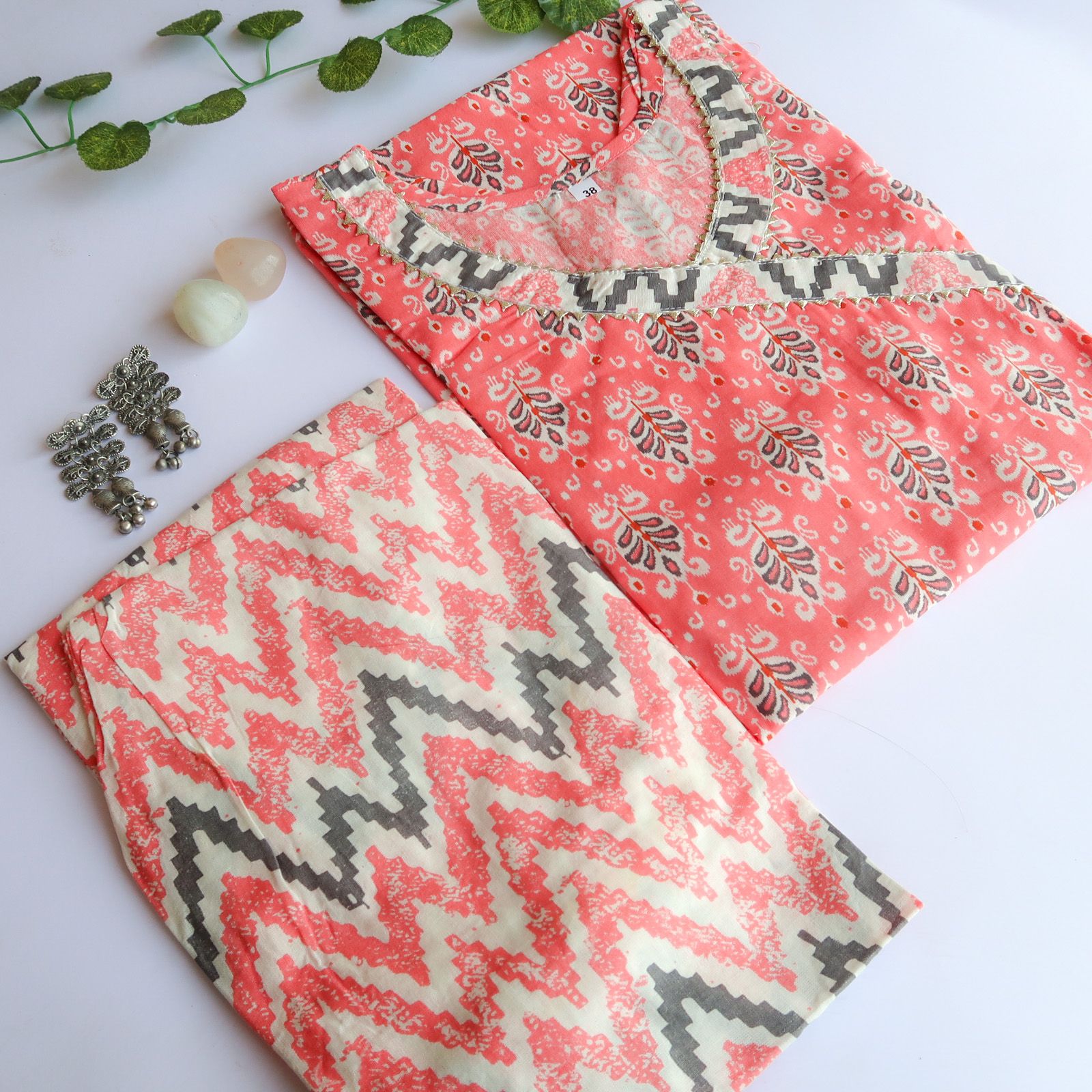 cotton kurta with cotton pants, Half drawstring and half elastic closure.