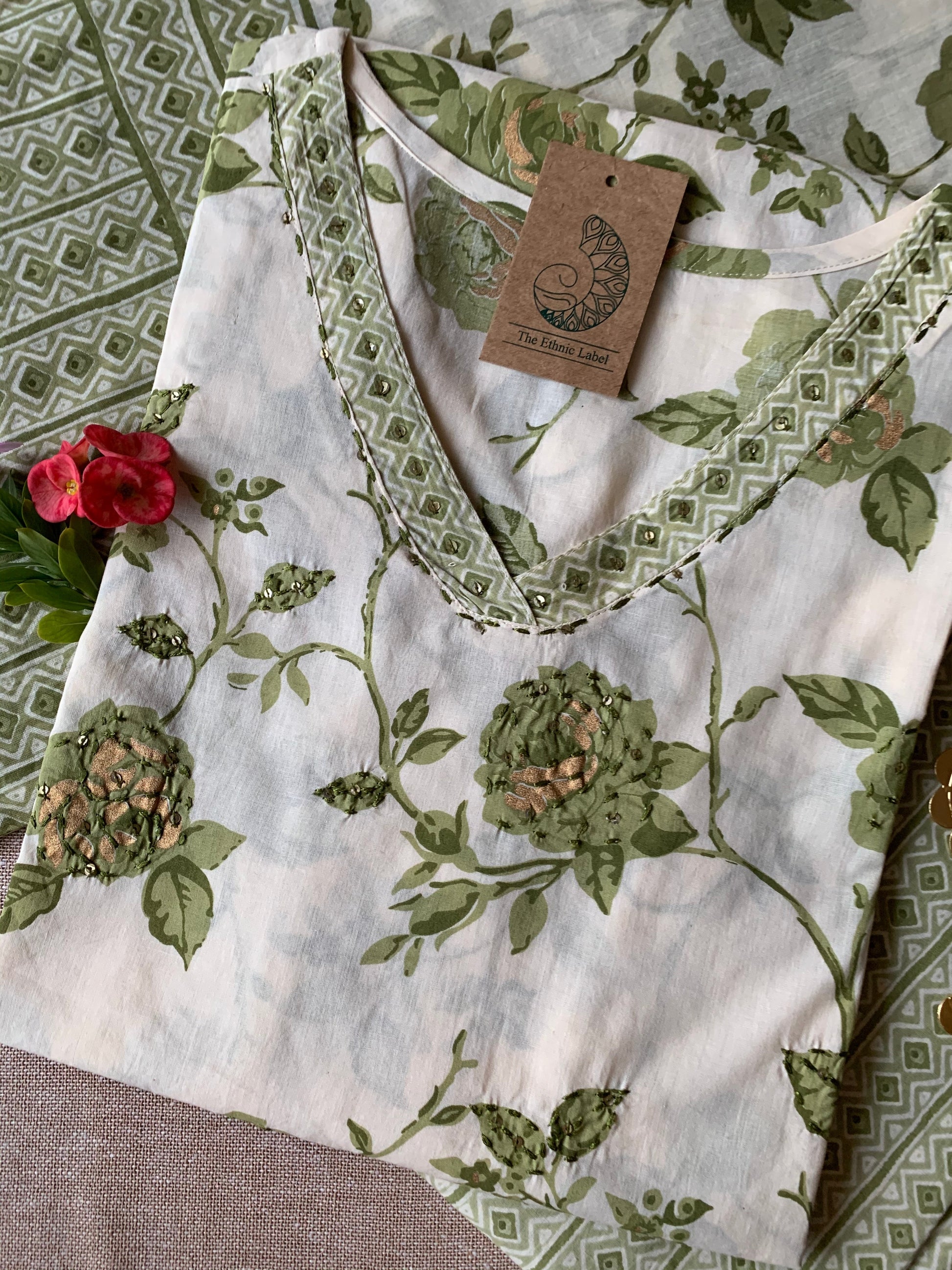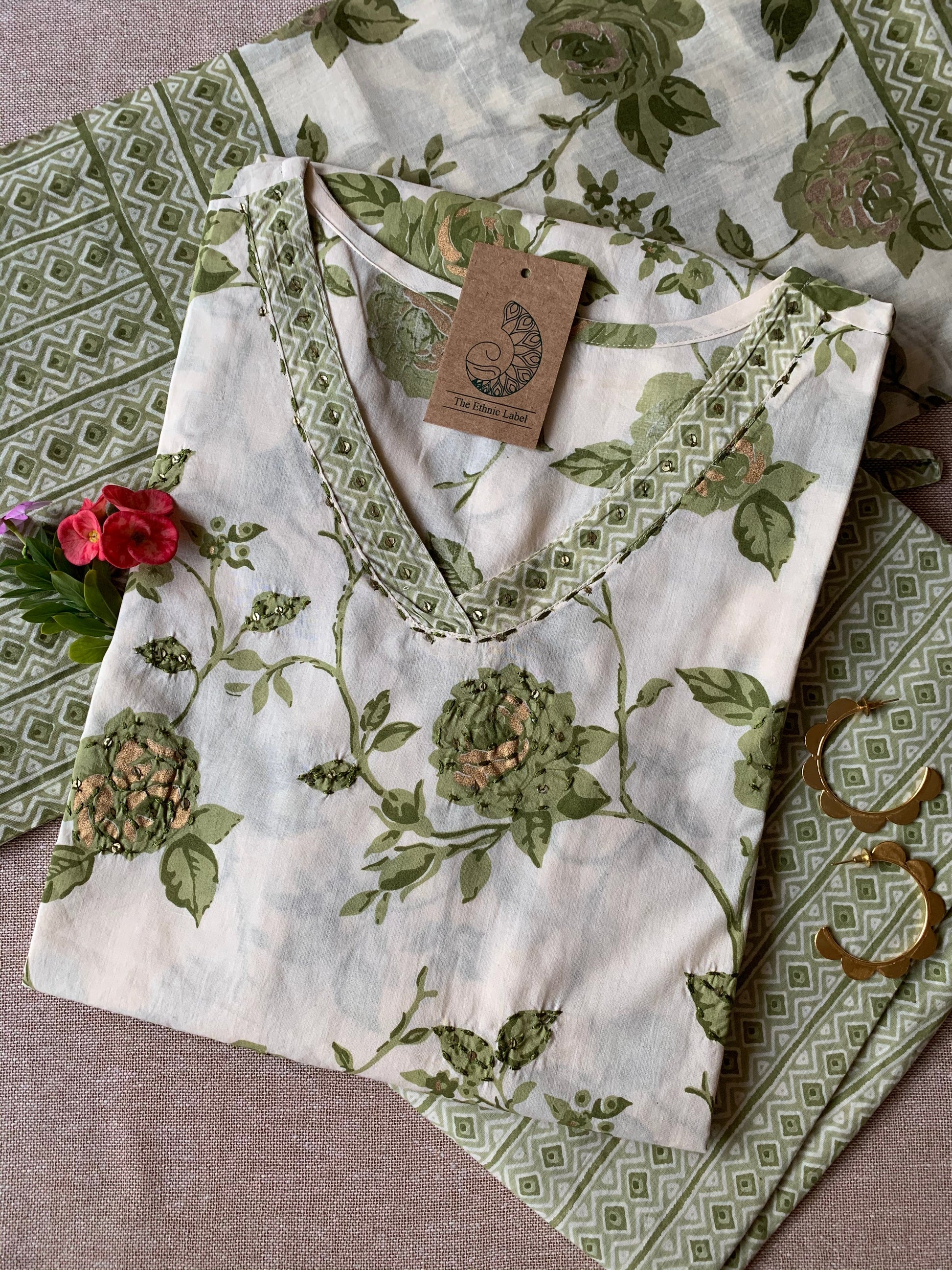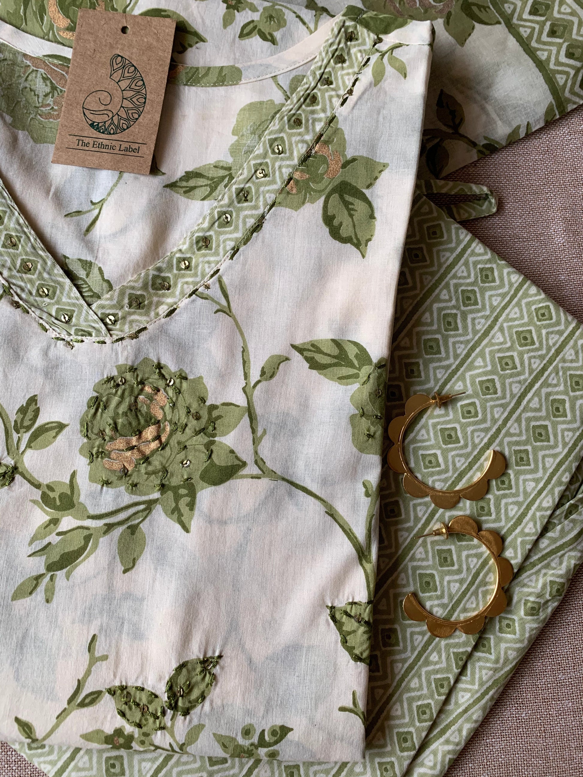 Cream Mehendi "Gold" Cotton Kurta Set with Dupatta - 3 pc